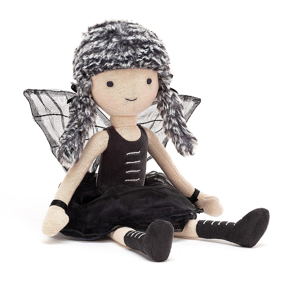 Faye Fairy is one funky friend! With humbug hair in two wild fuzzy bunches, black cobweb wings and a black mesh tutu, she's the goth-punk pixie who rocks the forest! Get those chunky boots stomping!