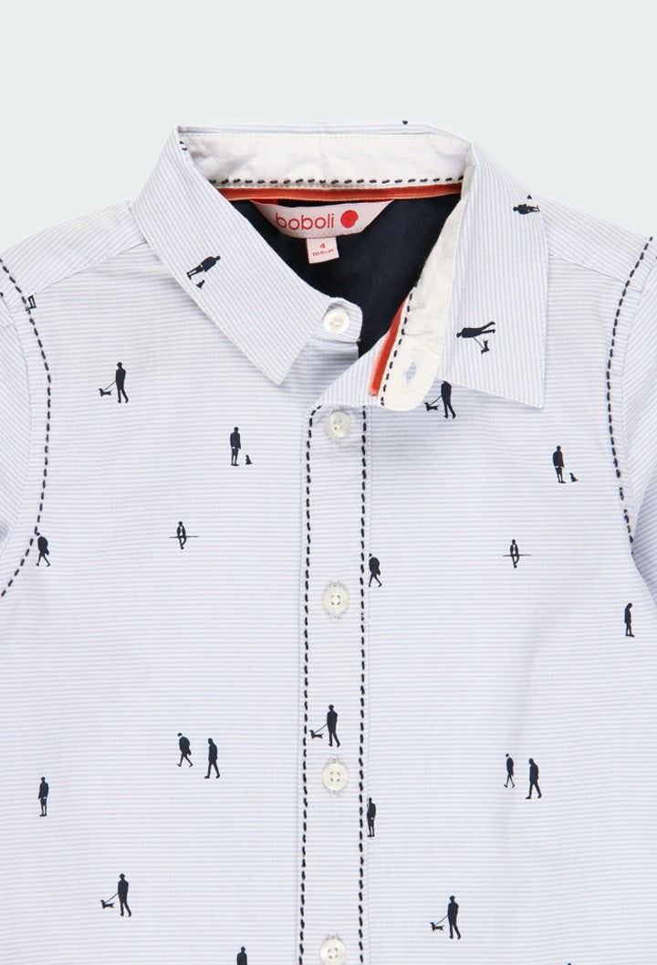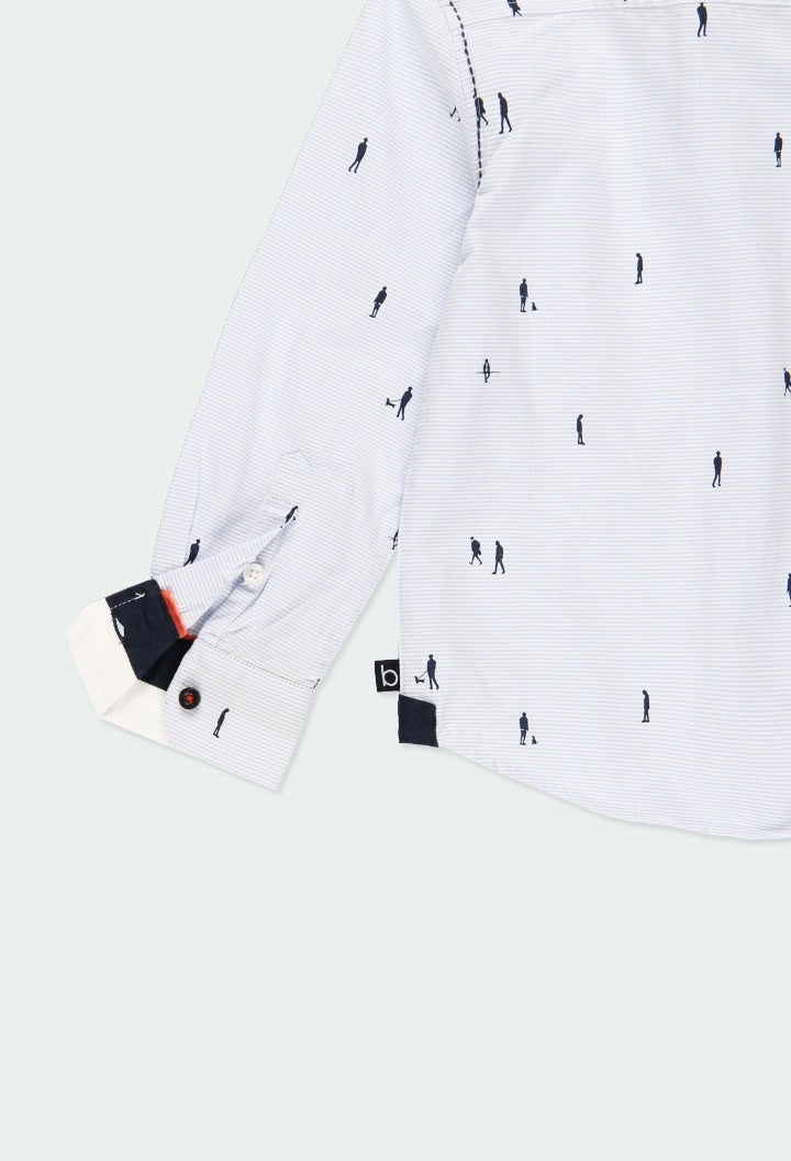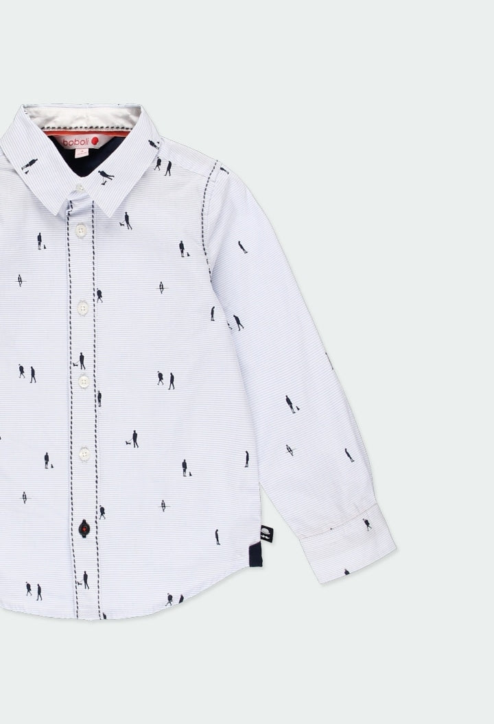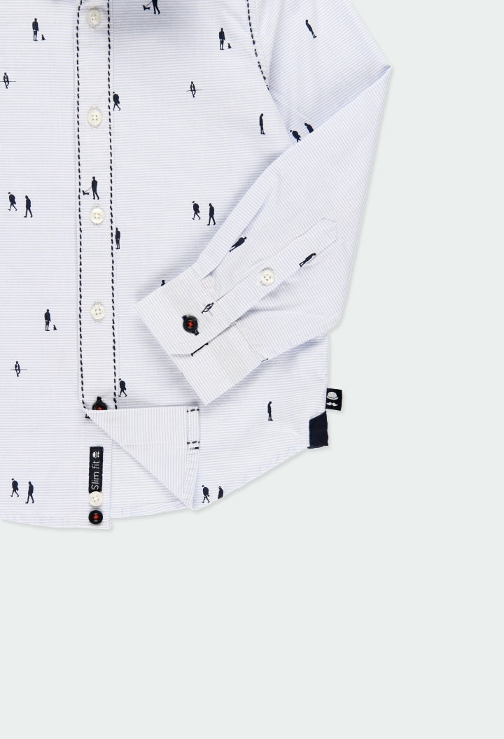Shirt for boys in light coloured poplin with print. Fastens with buttons at the front and on the cuffs. The print features thin light blue stripes on a white background and walking silhouettes in navy. Decorated with a label with brand detail. Slim fit.